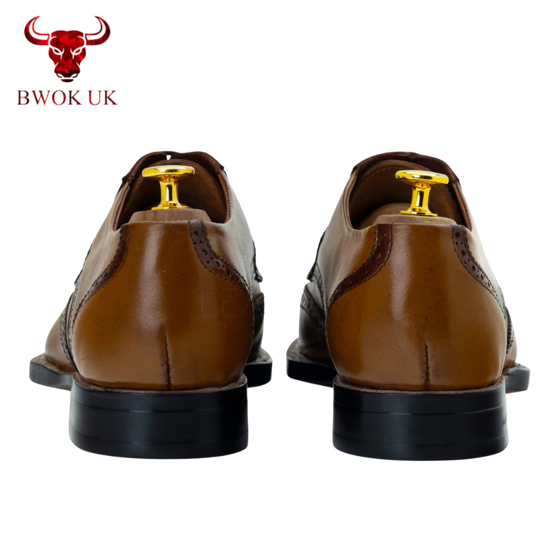Immerse yourself in the divine splendor of The Ashcroft Handmade Brogue Derby, crafted from 100% full-grain calf leather sourced from Italy’s most revered tanneries. This tan brown patina radiates a warm, luminous glow, its beautifully polished finish revealing a depth that captivates with every glance. As it ages, the leather unfolds a stunning patina, each mark a testament to its timeless journey. Lined with 100% genuine soft calf leather for breathable, luxurious comfort, The Ashcroft envelops your feet in the unmatched allure of Italian leather artistry.