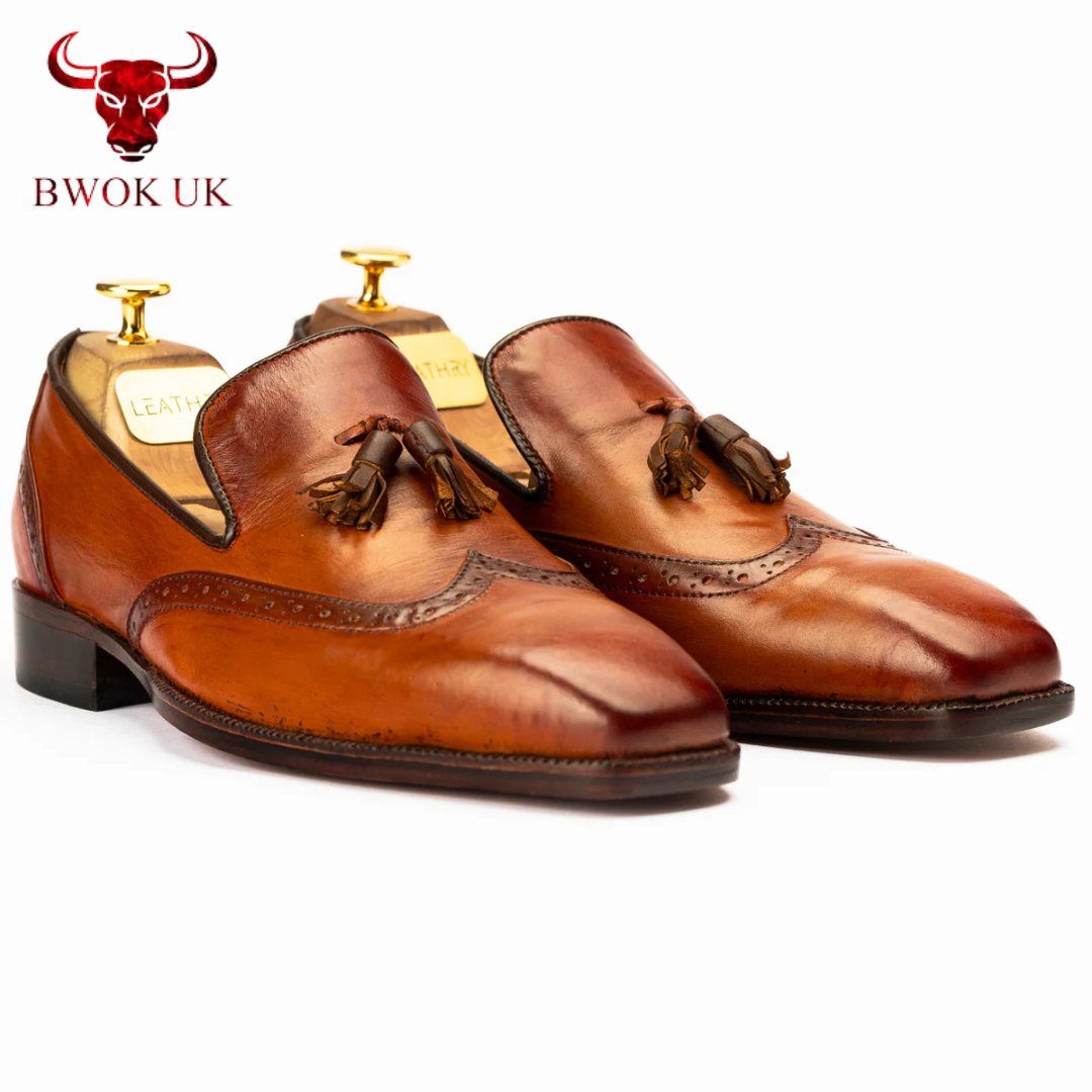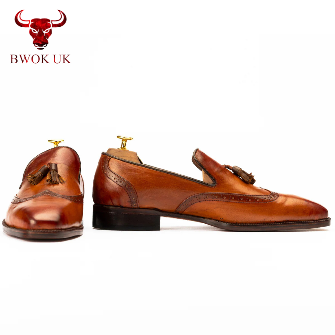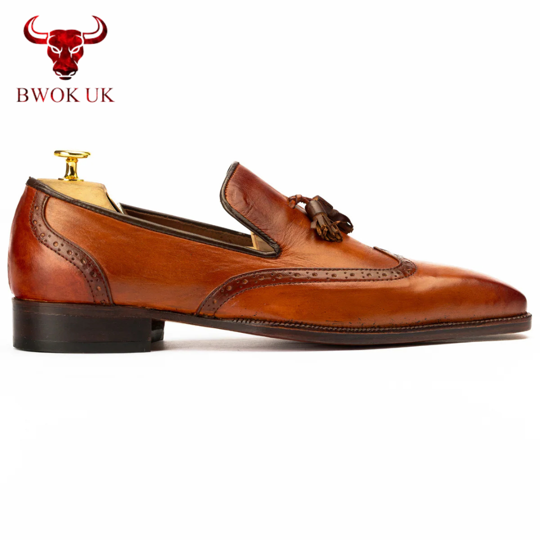 The Lennox Brogue Tassel Loafers adapt effortlessly to your lifestyle, transitioning seamlessly from formal to casual occasions. Pair them with a tailored suit for a polished office look, or slip them on with chinos for a refined weekend style—the tan brown patina adds a warm, versatile elegance to any outfit. Handmade with customizable color options, The Lennox offers the perfect blend of slip-on convenience and luxurious versatility, ensuring you step into every moment with unmatched sophistication.